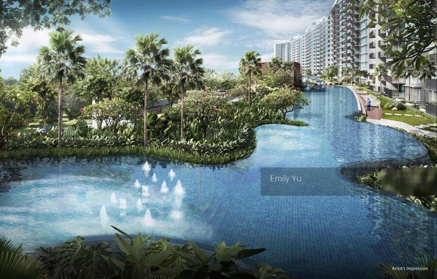 Waterbay has Serangoon River on one side and a swimming pool with water feature on the other.