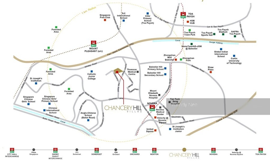 Chancery Hill Villas is located near commercial amenities such as United Square Shopping Mall, Square 2, ***** Square and the Orchard Shopping Belt which are all within 10 minutes of drive. It is also close to some medical institutions like Mount Elizabeth Novena Hospital, Tan Tock Seng Hospital, Thomson Medical Centre and Novena Medical Center.