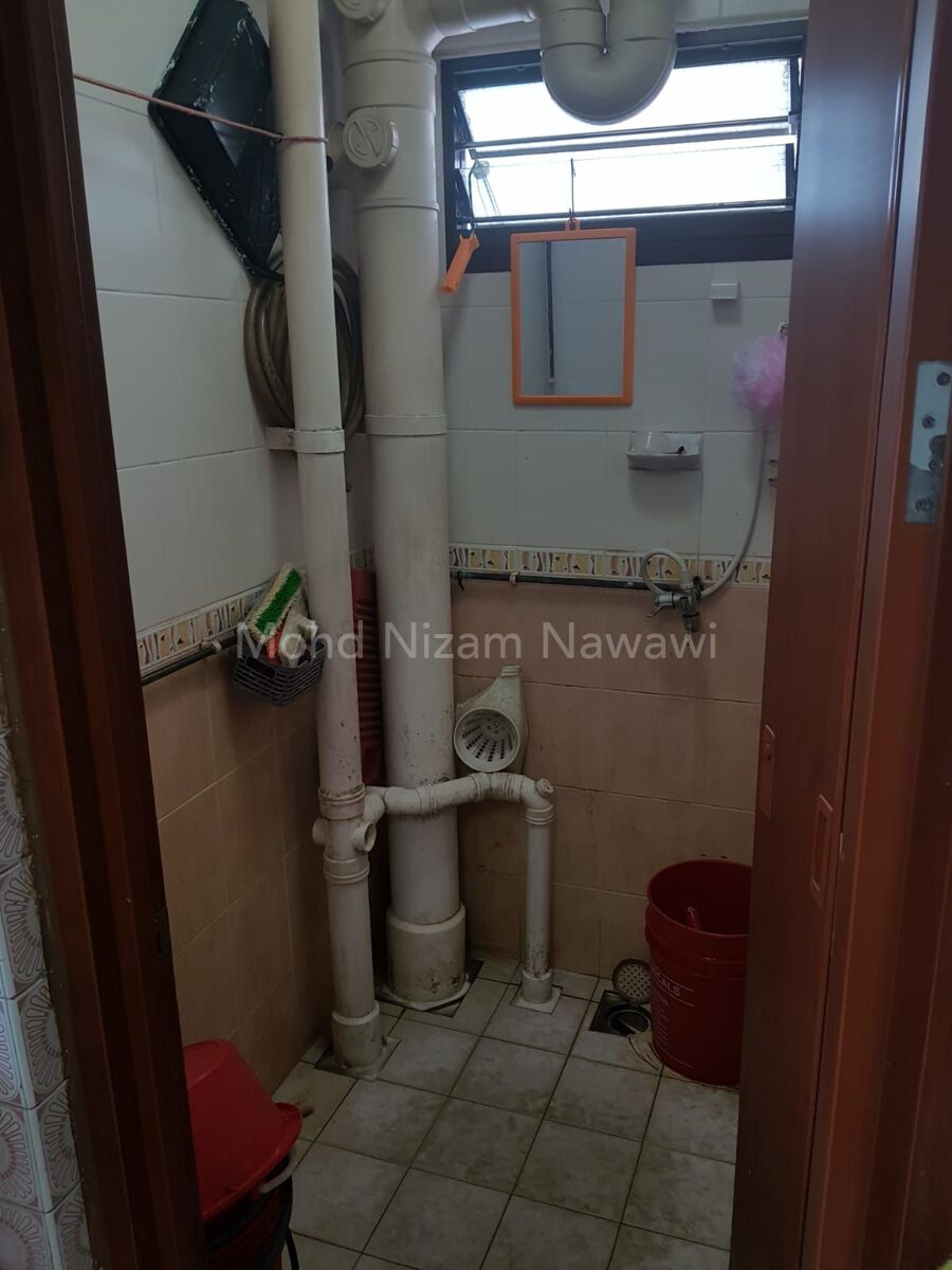 This is a 3I model flat, a modified version. Which means, it has no specific Master Bedroom and an attached bathroom but HDB has added up a space near the Kitchen. That essentially is a small Utility Room that can sleep a person within. Outside that Utility Room, there are 2 compartments, a Toilet and a Bathroom, placed side by side. Then there's the Kitchen area outside this 2 Toilet and Bathroom.