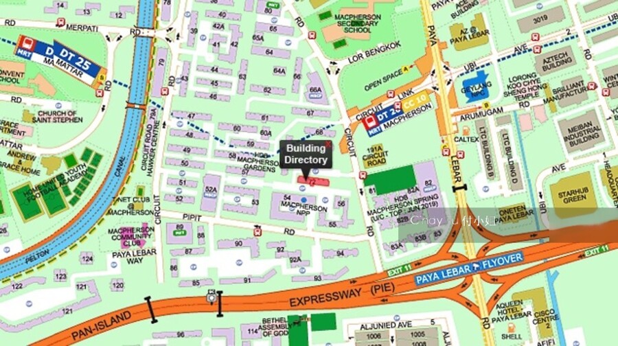 The nearest MRT/LRT station for Blk 72, Circuit Road is CC10 MacPherson which is about0.32km away . There is also an upcoming MRT DT26 macpherson 0.25km away. There are 17 bus stops near Blk 72, Circuit Road. There are1taxi stands near Blk 72, Circuit Road.