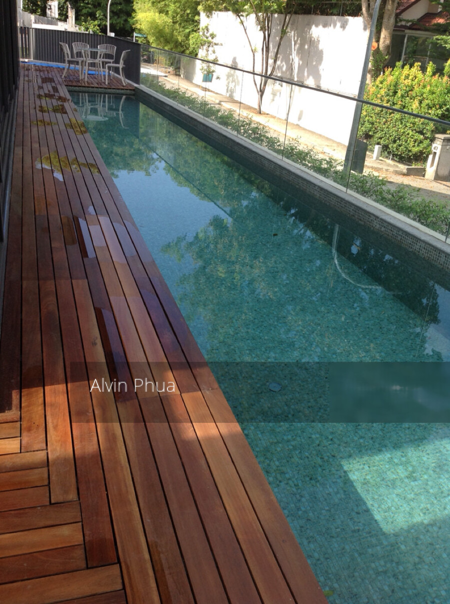 Grounded swimming pool and pool deck.