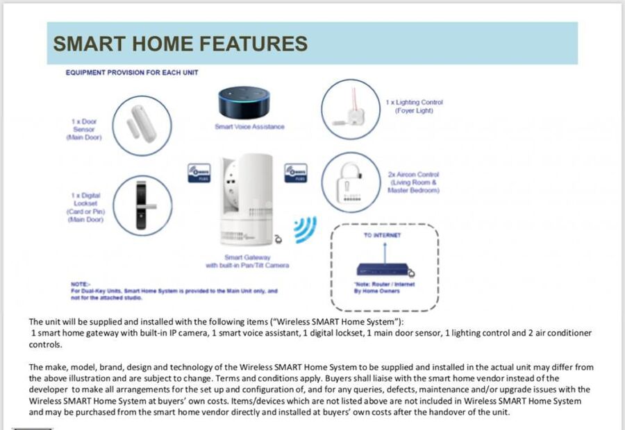 9. Wireless Smart Home System provision includes Smart home gateway with pan and tilt camera x 1, Smart voice assistant x 1, Smart digital lockset x 1, Smart door Sensor x 1, Smart lighting Control x 1 and Smart air condition control x 2