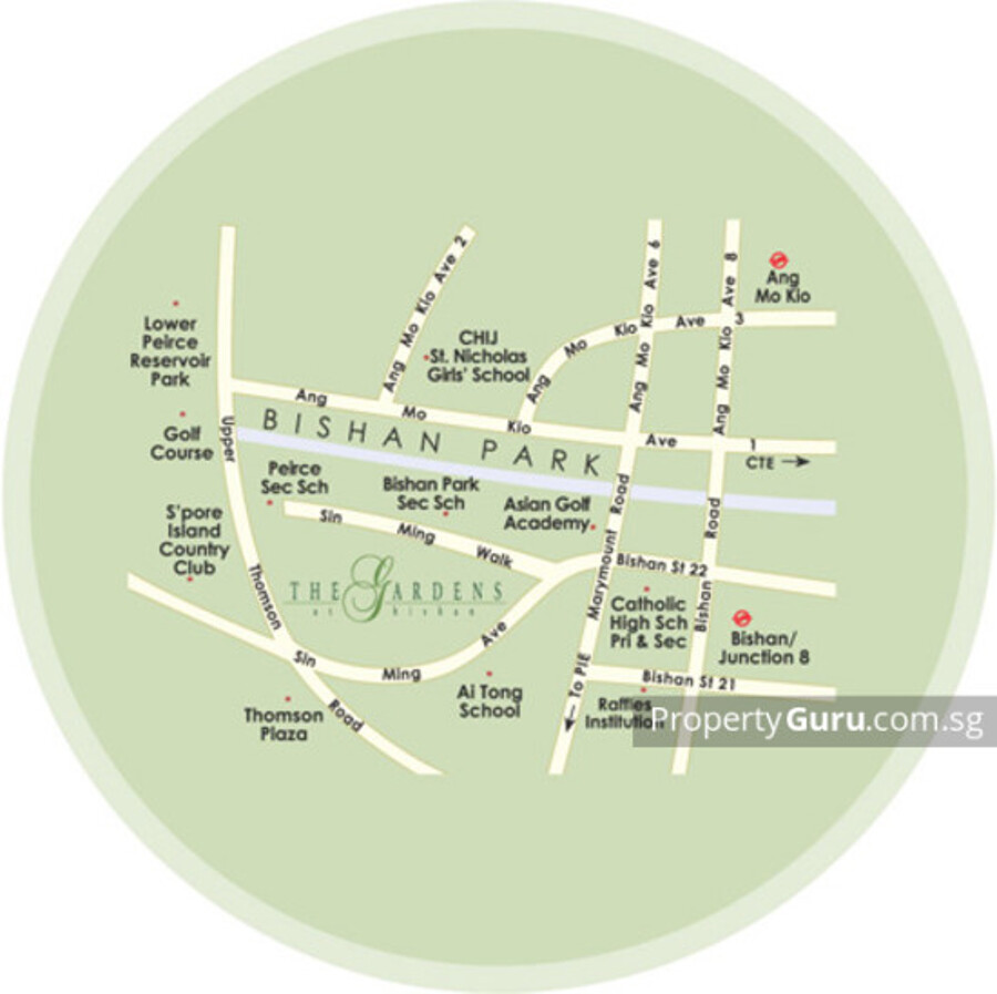 The Gardens at Bishan is accessible via Upper Thomson Road and Ang Mo Kio Avenue 1. You can take a short feeder bus ride to the Junction 8 Shopping Centre and Bishan MRT station. Thomson Plaza and Singapore Island Country Club are a 5-minute drive away. Residents can use the Central Expressway (CTE) and Pan Island Expressway (PIE) to travel to different parts of the island. For vehicle owners, driving from The Gardens at Bishan to either the business hub or the vibrant Orchard Road shopping district takes 15 - 20 minutes, via Central Expressway and Marymount Road respectively.